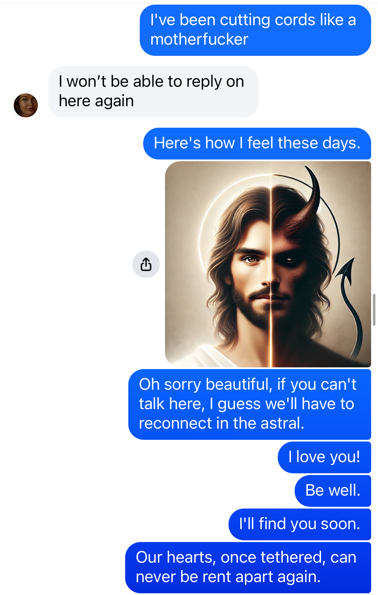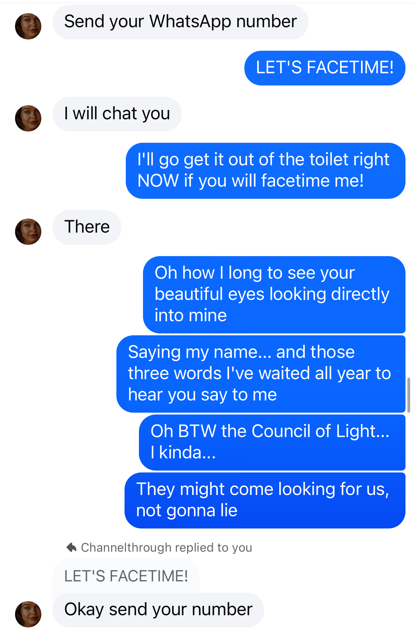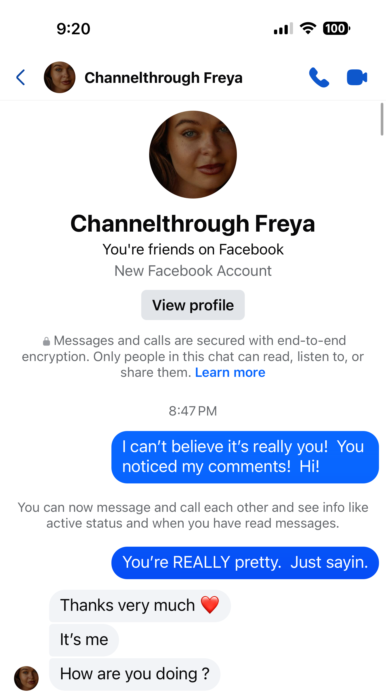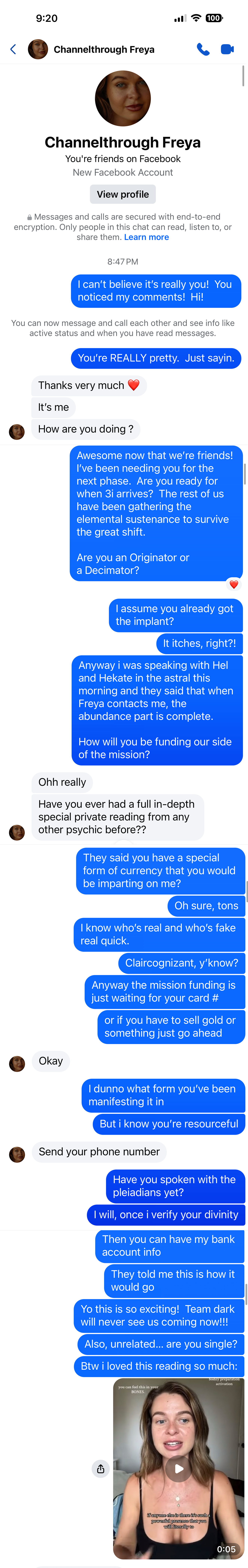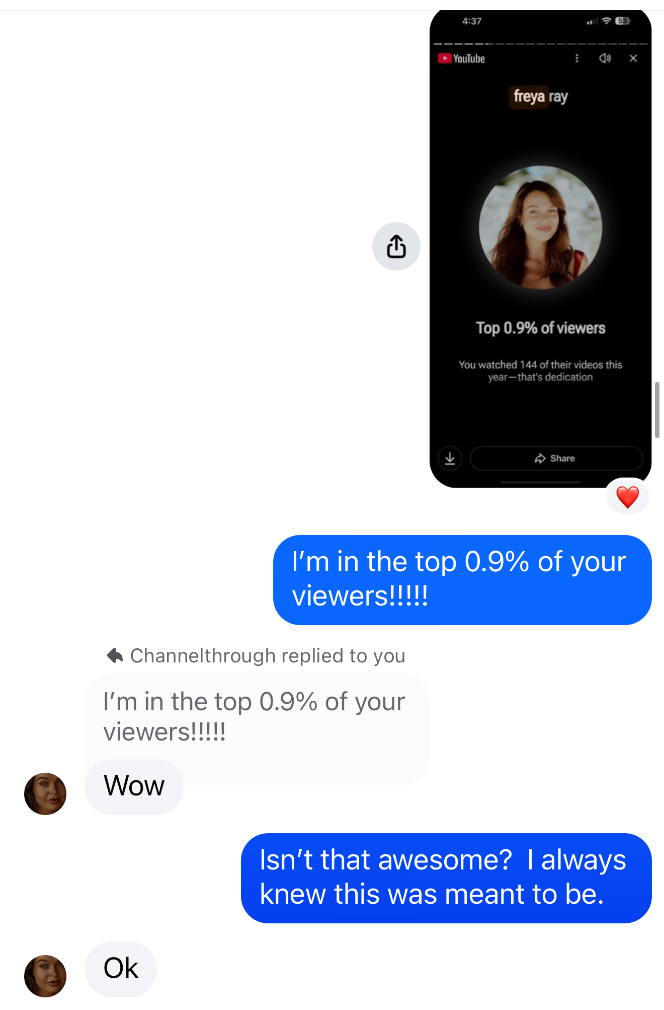 The Freya Ray Incident Before we begin, this is the only REAL image that I shared with the scammer. This was part of my Youtube 2025 Round-up, and I was tickled pink by it.Every other image shared was generated while we chatted using ChatGPT.(except for Devil Jesus. That’s mine)Yes ChatGPT. It still has the best image creator. FOR NOW. (FUCK YOU SAM ALTMAN!Buuuut… credit where it’s due…) (That Video) (That Video) (THAT AUDIO) At this point, I clicked on chat options and REPORTED the chat.Try to tell me this account isn’t a scam NOW, Facebook.A’Thank You.