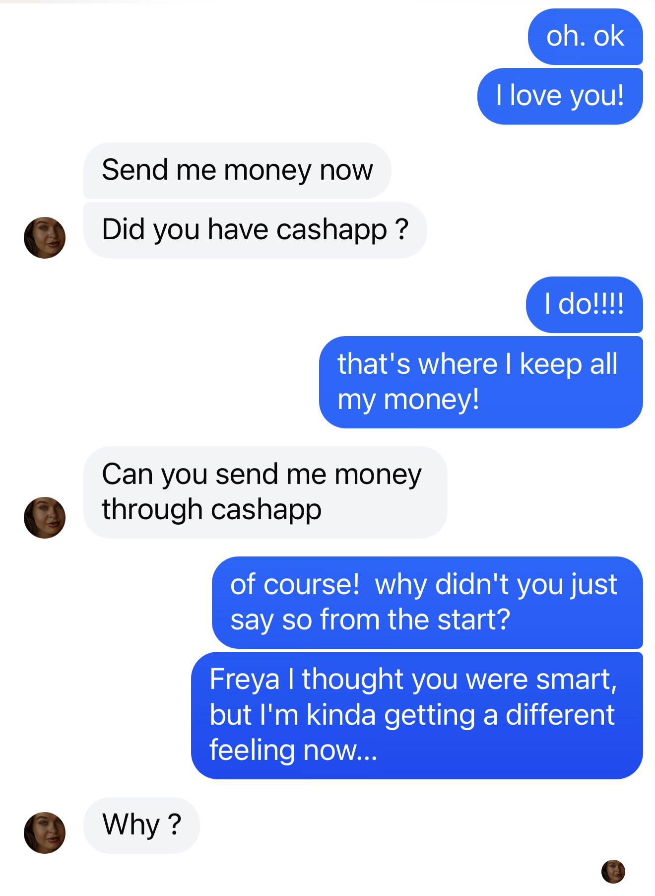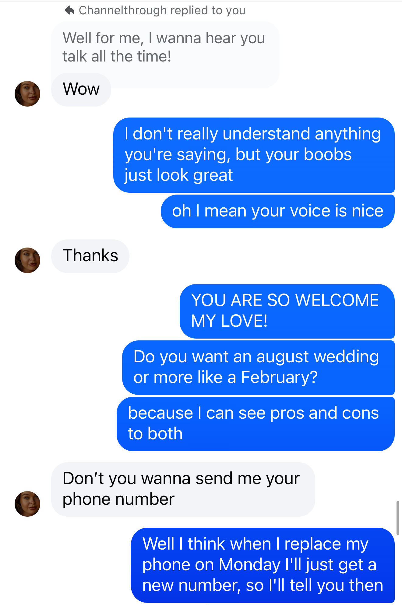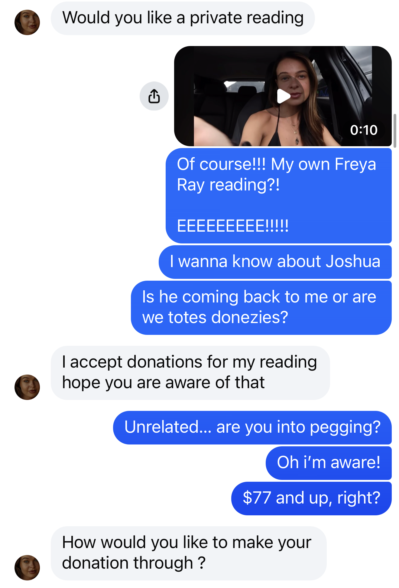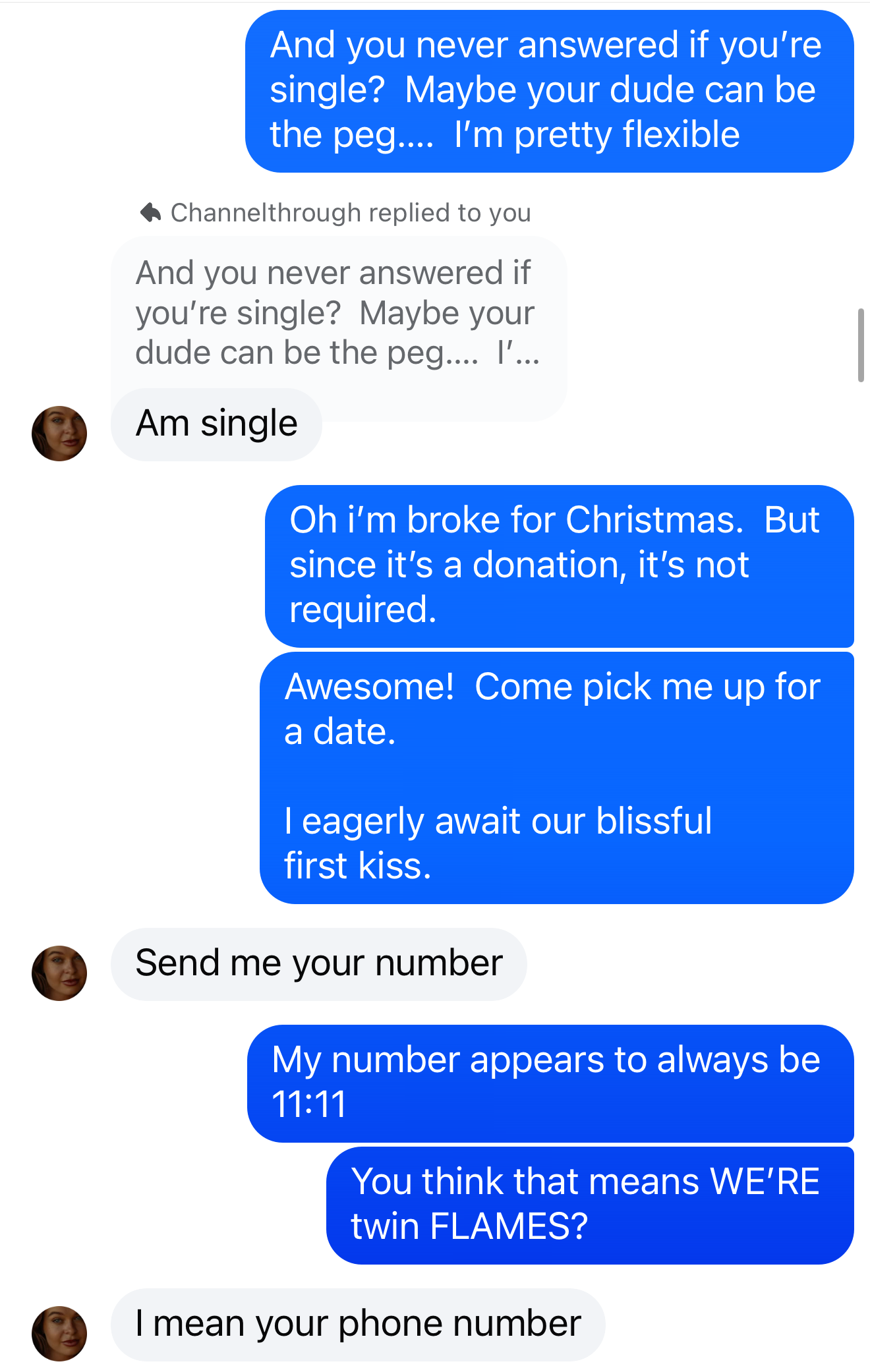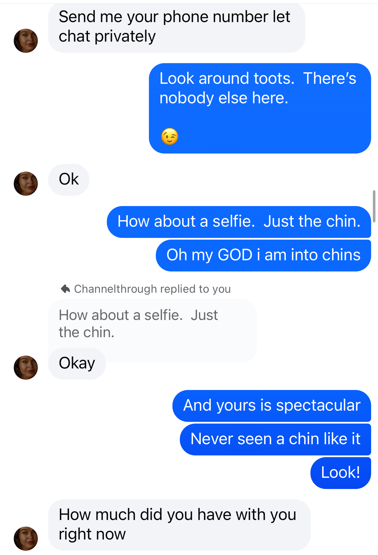 The Freya Ray Incident Before we begin, this is the only REAL image that I shared with the scammer. This was part of my Youtube 2025 Round-up, and I was tickled pink by it.Every other image shared was generated while we chatted using ChatGPT.(except for Devil Jesus. That’s mine)Yes ChatGPT. It still has the best image creator. FOR NOW. (FUCK YOU SAM ALTMAN!Buuuut… credit where it’s due…) (That Video) (That Video) (THAT AUDIO) At this point, I clicked on chat options and REPORTED the chat.Try to tell me this account isn’t a scam NOW, Facebook.A’Thank You.