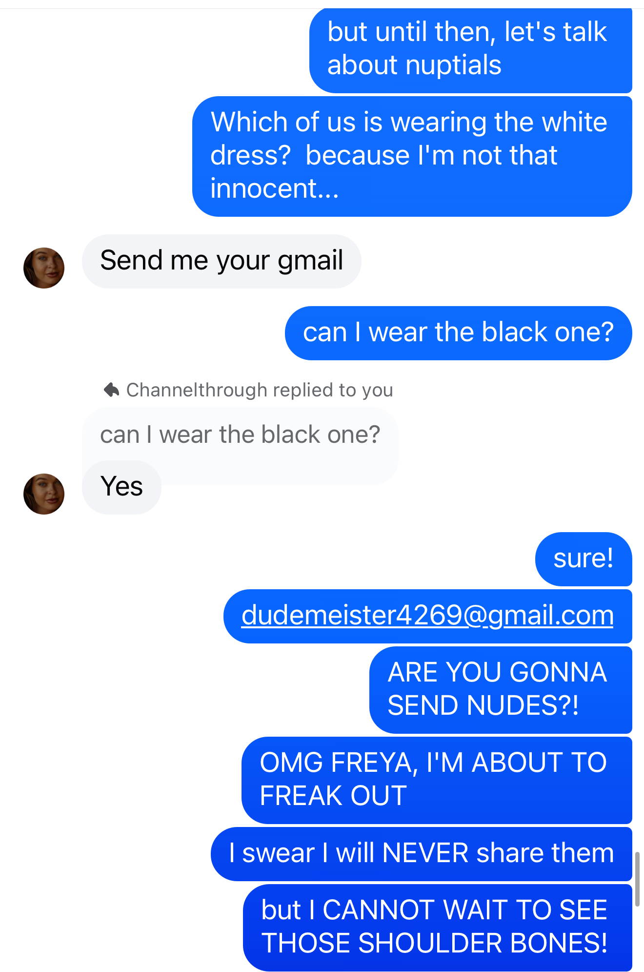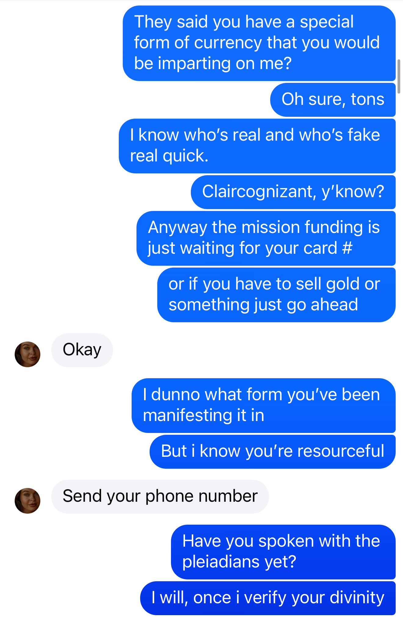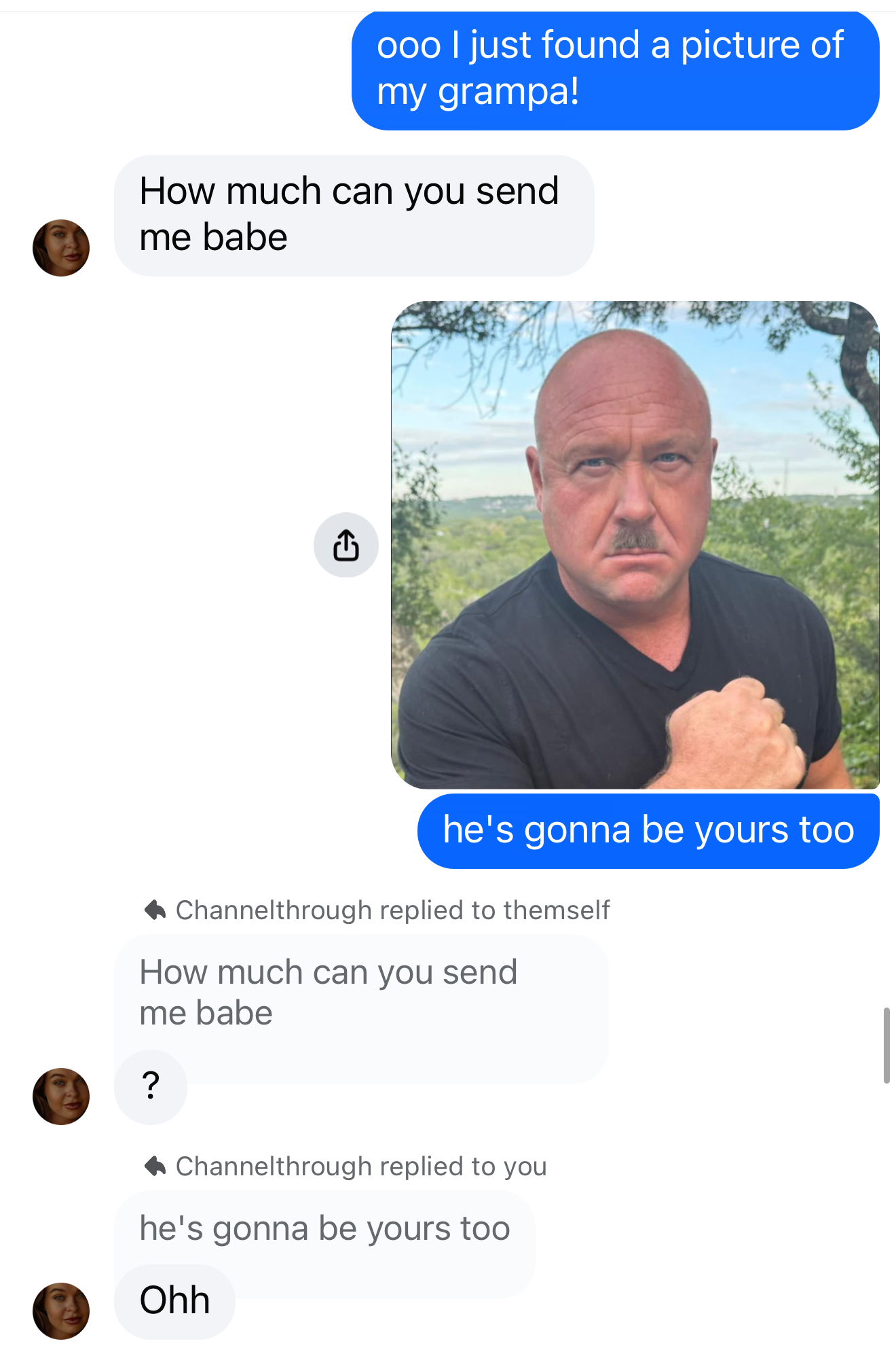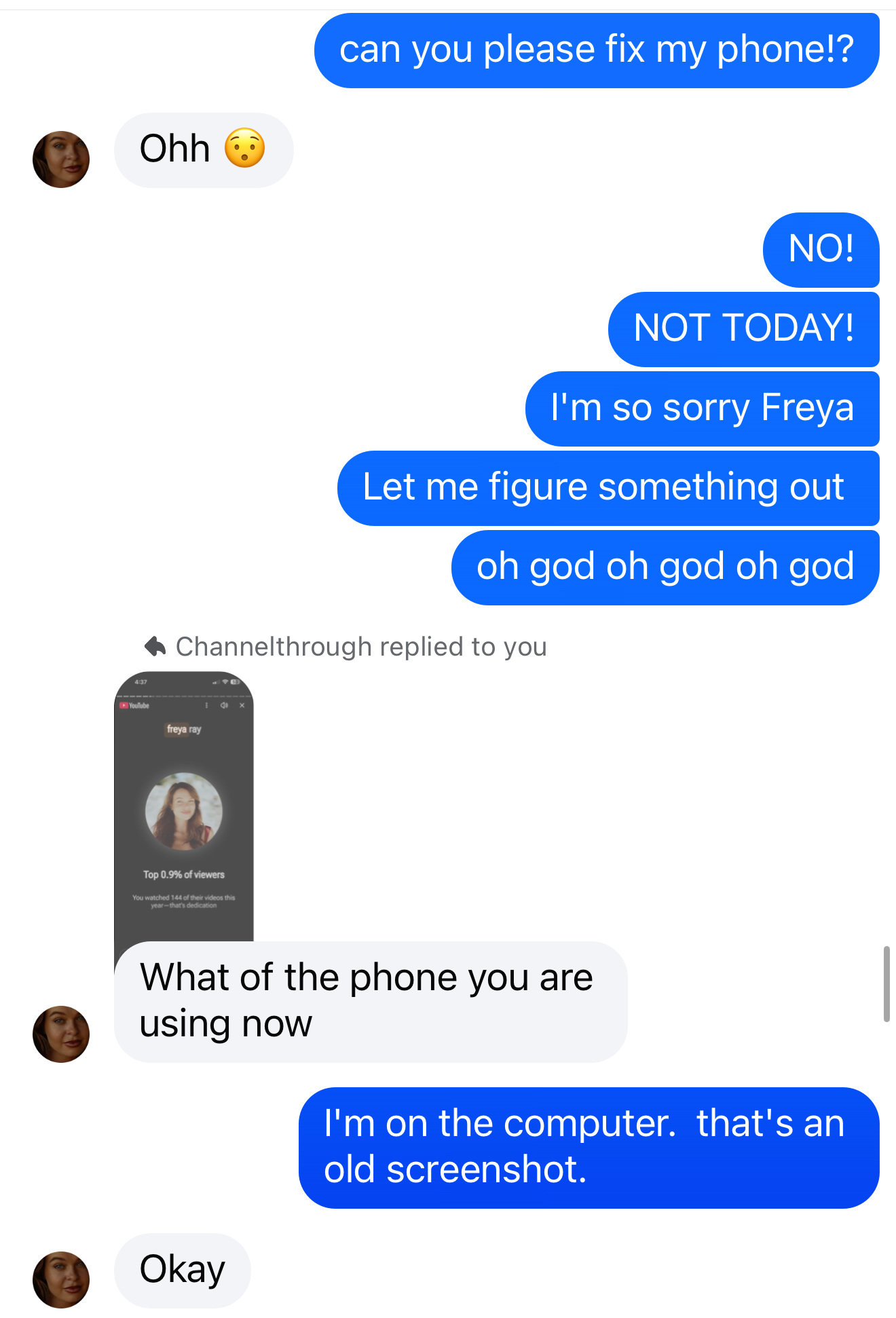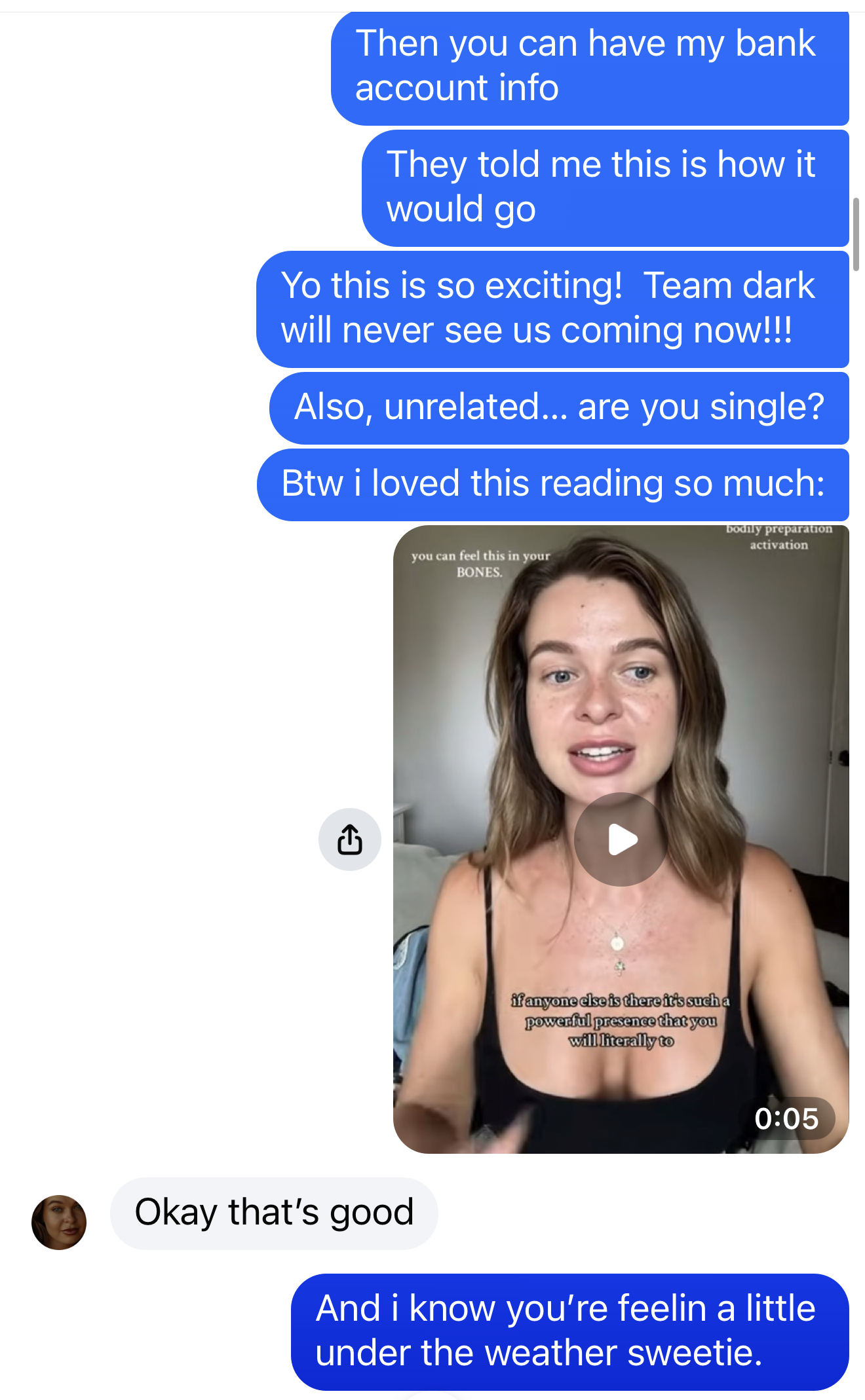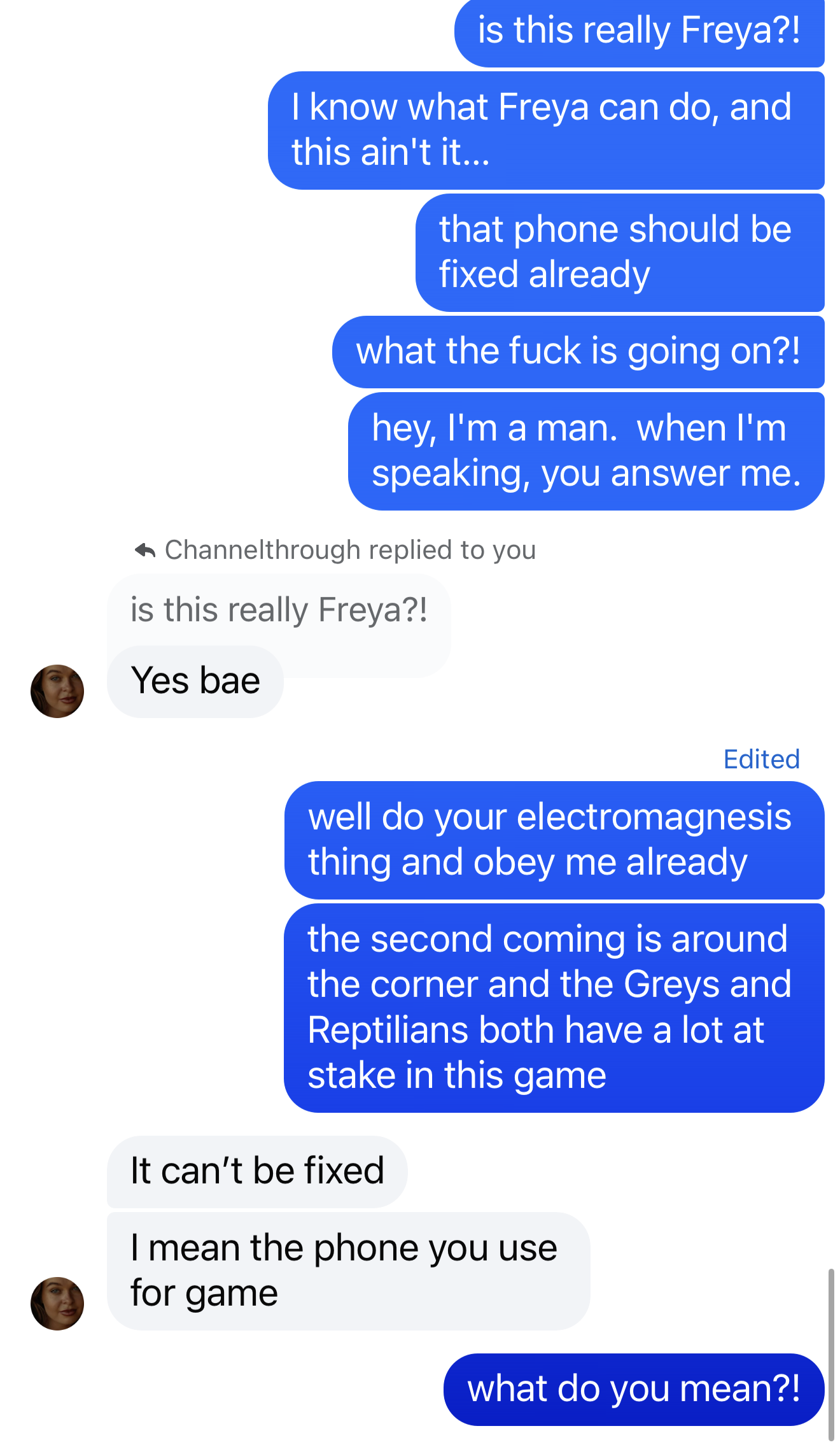 The Freya Ray Incident Before we begin, this is the only REAL image that I shared with the scammer. This was part of my Youtube 2025 Round-up, and I was tickled pink by it.Every other image shared was generated while we chatted using ChatGPT.(except for Devil Jesus. That’s mine)Yes ChatGPT. It still has the best image creator. FOR NOW. (FUCK YOU SAM ALTMAN!Buuuut… credit where it’s due…) (That Video) (That Video) (THAT AUDIO) At this point, I clicked on chat options and REPORTED the chat.Try to tell me this account isn’t a scam NOW, Facebook.A’Thank You.