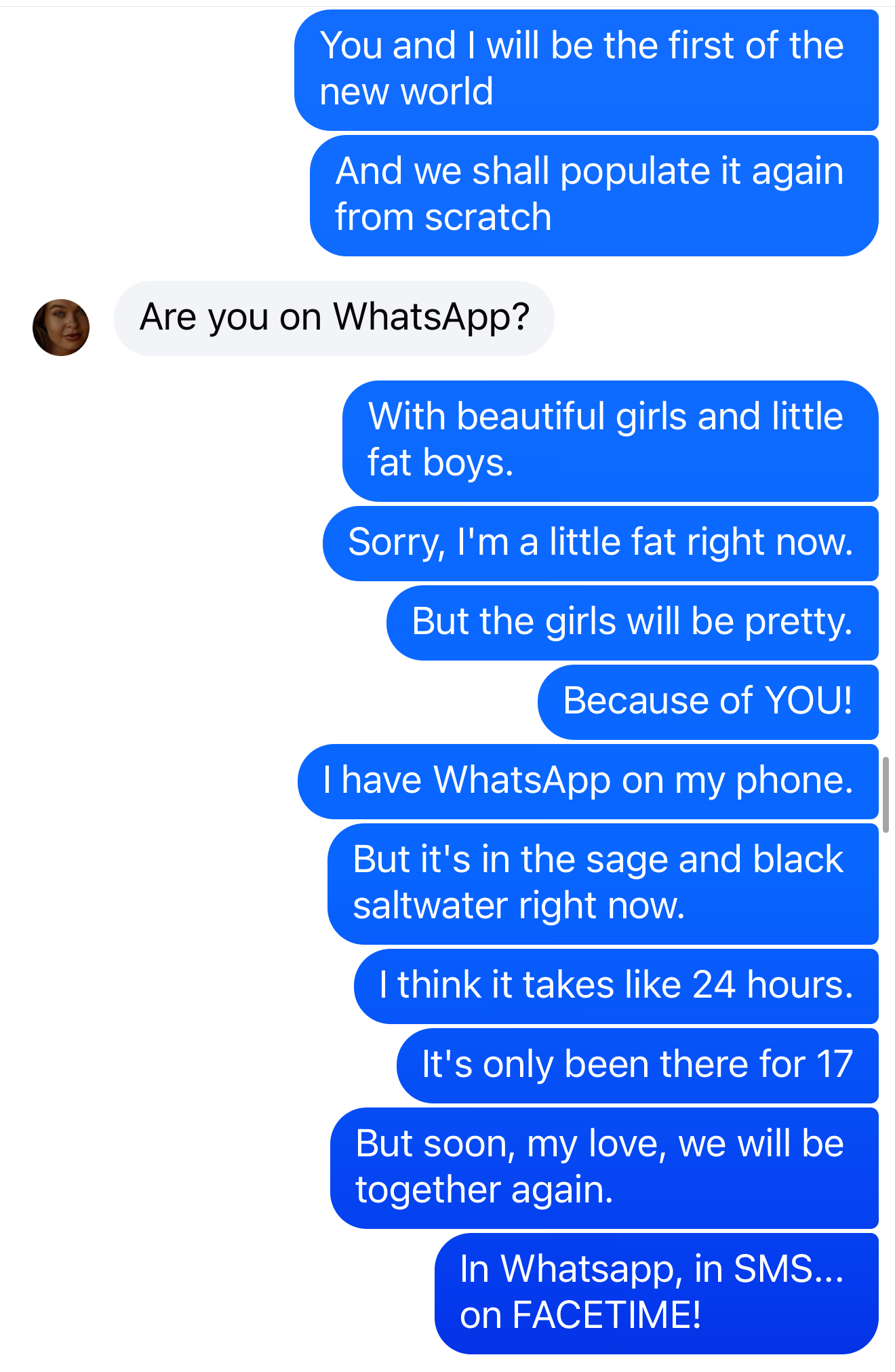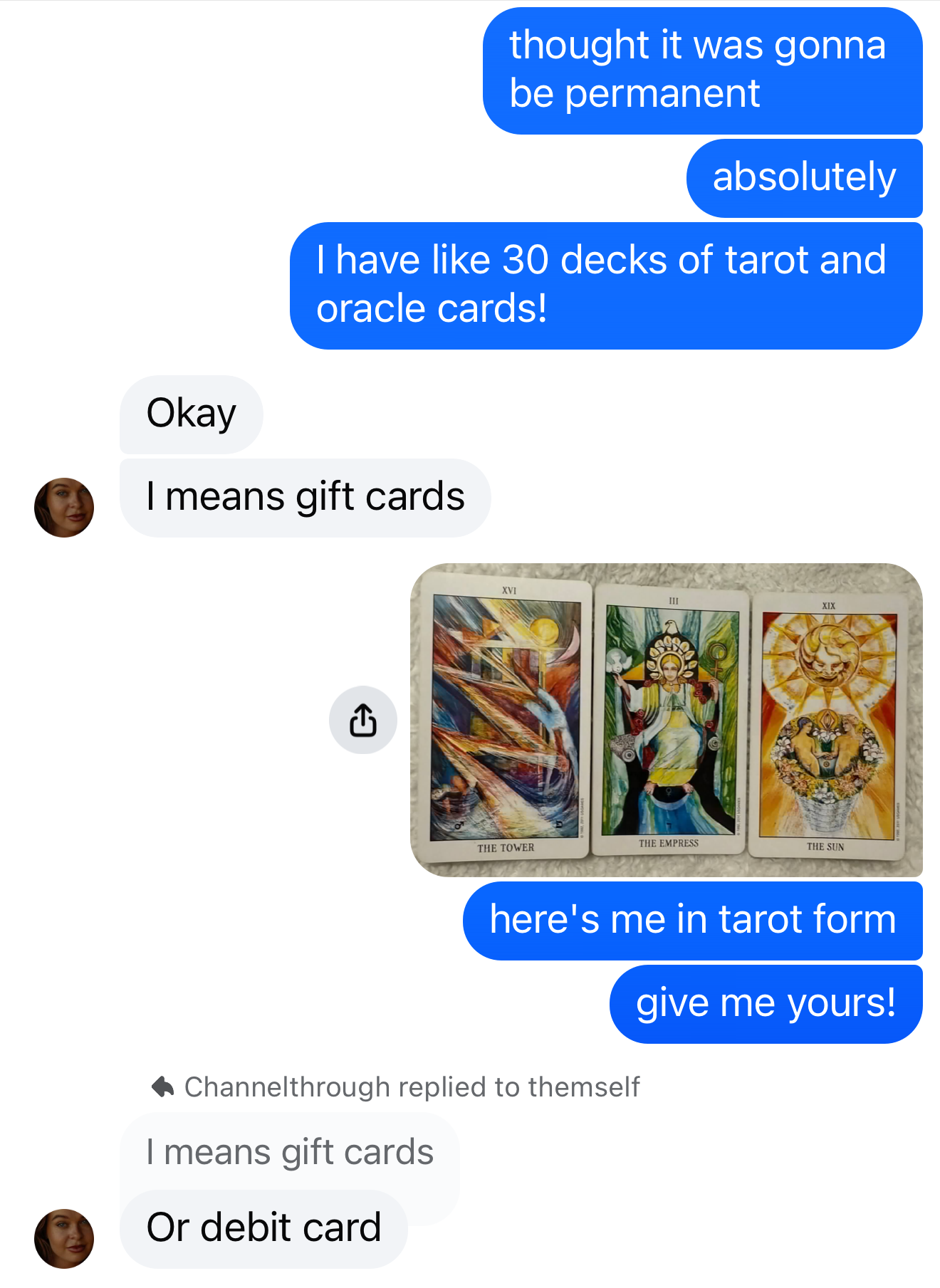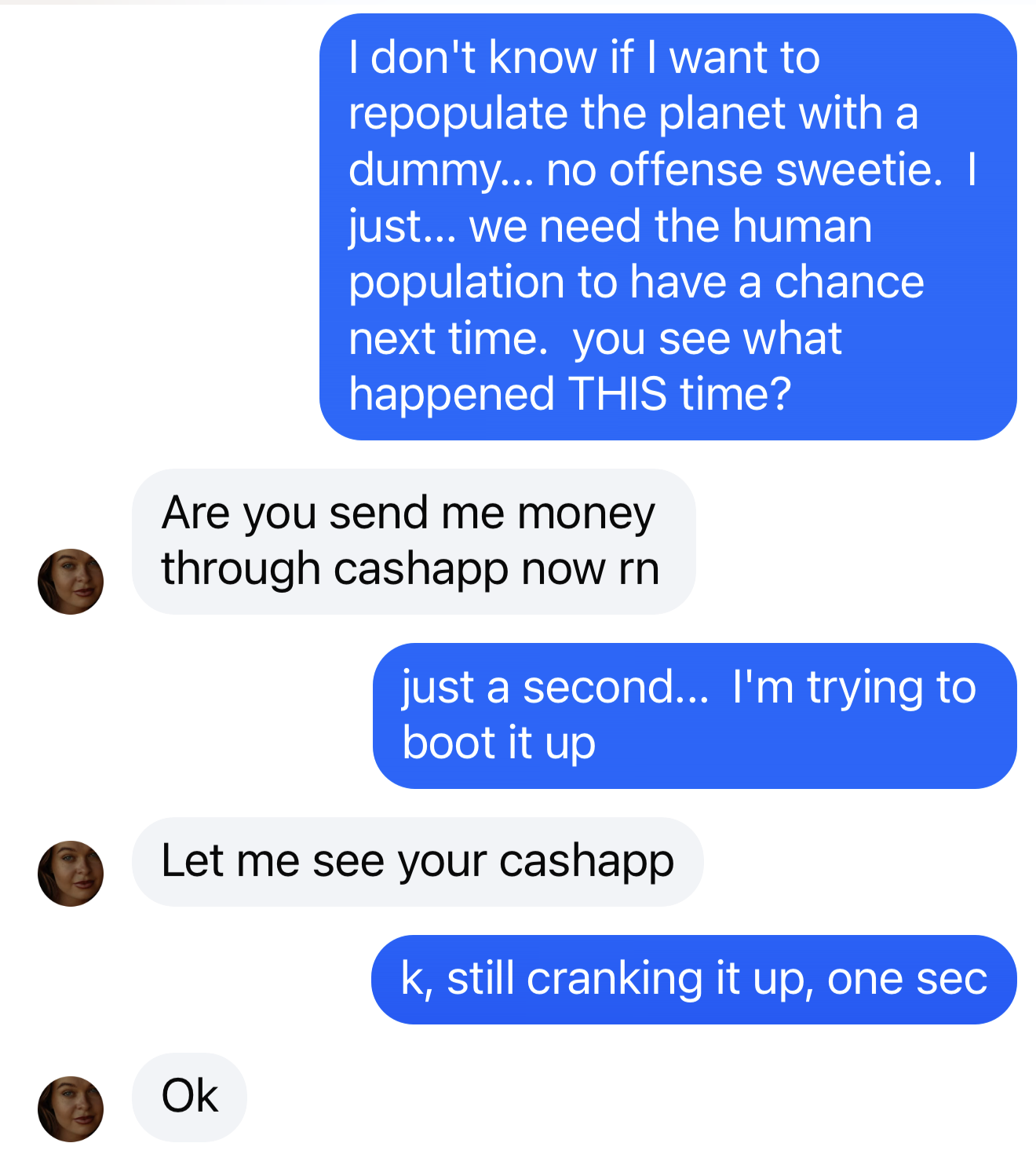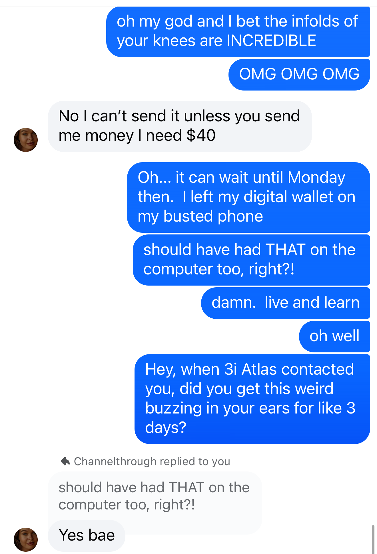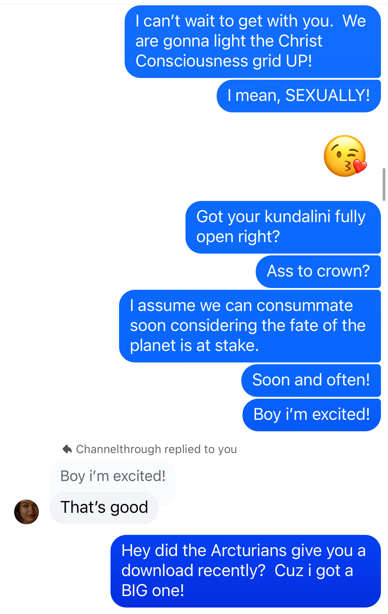 The Freya Ray Incident Before we begin, this is the only REAL image that I shared with the scammer. This was part of my Youtube 2025 Round-up, and I was tickled pink by it.Every other image shared was generated while we chatted using ChatGPT.(except for Devil Jesus. That’s mine)Yes ChatGPT. It still has the best image creator. FOR NOW. (FUCK YOU SAM ALTMAN!Buuuut… credit where it’s due…) (That Video) (That Video) (THAT AUDIO) At this point, I clicked on chat options and REPORTED the chat.Try to tell me this account isn’t a scam NOW, Facebook.A’Thank You.